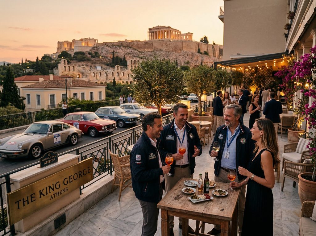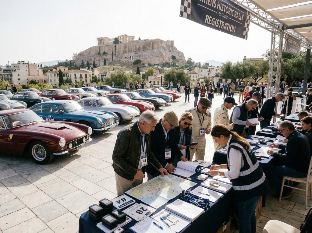 Athen ist der perfekte Ort, um diese Reise zu beginnen. Nach dem Check-in im Royal Olympic Athens — einem klassisch-eleganten Fünf-Sterne-Hotel mit besonderem Blick auf den Tempel des Olympischen Zeus und die Akropolis — startet der Tag im offenen Fahrerlager mit administrativer und technischer Kontrolle, der Ausgabe von Roadbooks, Karten, Startnummern und GPS-Tracking-Systemen: genau jenem Ritual, das jede große Rallye erst richtig real macht. Beim Aufwärmen und Vorabtest treffen konzentrierte Blicke auf aufheulende Motoren, und spätestens in der Fahrerbesprechung wird klar: Hier geht es um weit mehr als Geschwindigkeit — gefragt sind Taktgefühl, Präzision und ein feines Gespür für Maschine und Strecke. Beim Aperitivo und gemeinsamen Abendessen löst sich die Spannung langsam, Gespräche kreisen um Übersetzungen, Streckenprofile und dieses besondere Kribbeln vor dem Start. Noch steht der Wagen — doch innerlich ist man längst unterwegs.