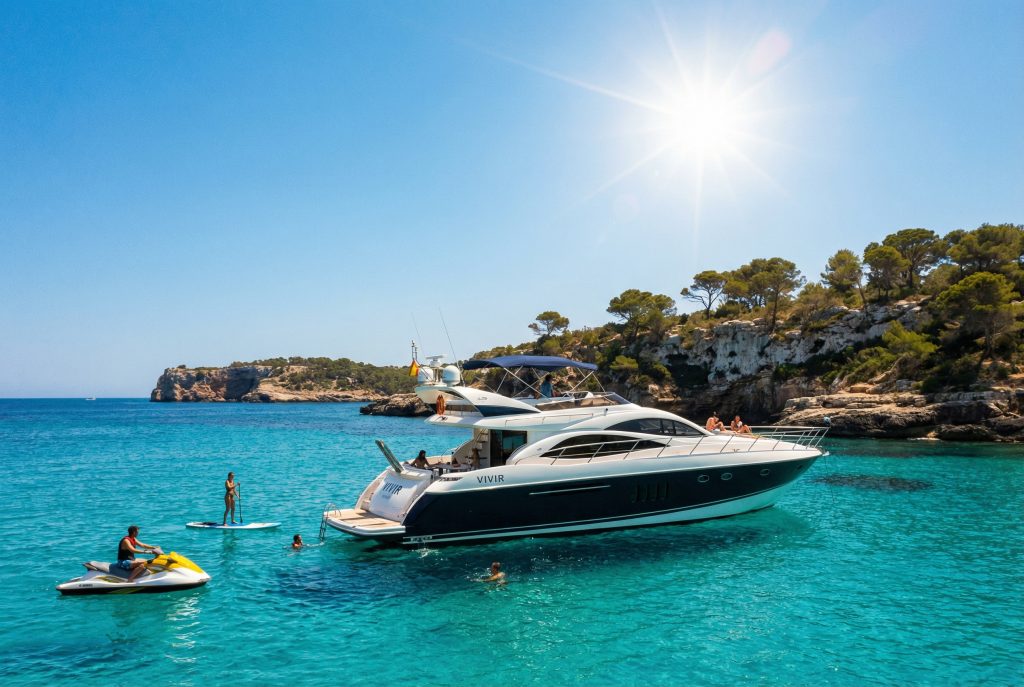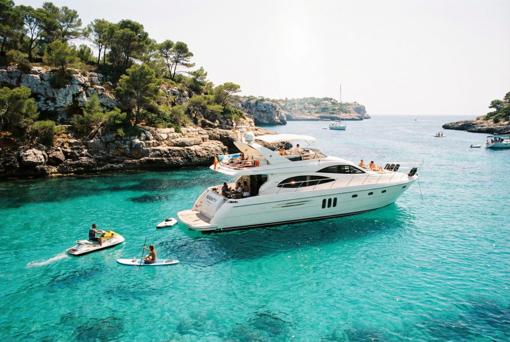 Nach dem Frühstück tauschen wir Asphalt gegen Wasser und erleben Mallorca aus einer Perspektive, die selbst Inselkenner noch einmal neu staunen lässt. Beim Yachtausflug entlang der Küste fahren wir vorbei an Felsen, Buchten und versteckten Stränden, deren Farben vom Deck aus fast unwirklich wirken. Zwischendurch bleibt Zeit für verschiedene Water Toys, zum Baden oder einfach zum entspannten Zurücklehnen an Deck, während das Mittelmeer sich von seiner besten Seite zeigt. Dazu gibt es Catering und BBQ an Bord, sodass Genuss und Meerluft ganz selbstverständlich ineinander übergehen. Mallorca war vom Wasser aus über Jahrhunderte immer auch Insel der Seefahrer, Händler und gelegentlich Piraten – die alten Wachtürme entlang der Küste erinnern noch heute daran, dass der Blick aufs Meer früher nicht nur romantisch, sondern ziemlich nützlich war. Heute schaut man deutlich entspannter hinaus, idealerweise mit Sonnenbrille und einem kühlen Getränk in der Hand. Ein Tag, der nicht laut sein muss, um spektakulär zu sein.