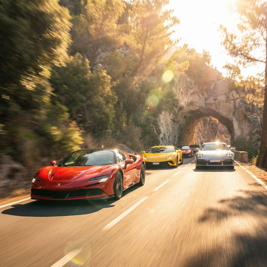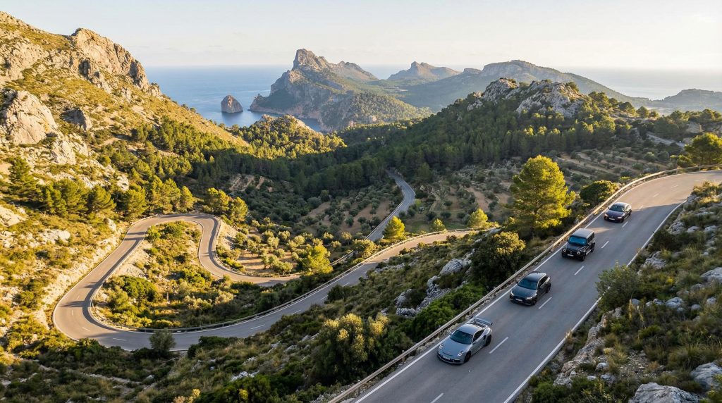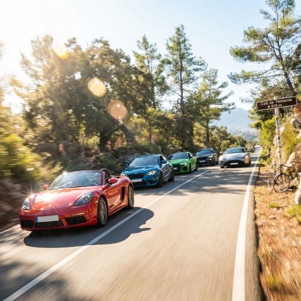 Mallorca, wie es Autofahrer lieben: Küstenluft, goldenes Licht – und dann hinein in die Serra de Tramuntana, wo Kehren und perfekte Linien den Puls treiben. Sportlich-dynamisches Fahren trifft auf Inselatmosphäre, Panoramen und mediterranen Genuss.