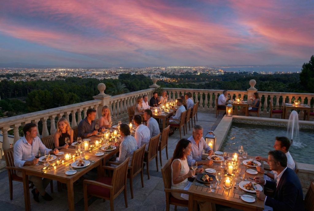 Heute führt uns die zweite Tour über den Osten und Südosten der Insel in Richtung Süden – fahrerisch reizvoll, landschaftlich abwechslungsreich und mit jener Mischung aus flüssigen Abschnitten und technisch interessanten Kurven, die den Tag spannend macht. Auf dem Weg zeigt Mallorca eine andere Seite: weite Felder, alte Fincas, Trockenmauern und jene stille Ursprünglichkeit, die oft direkt hinter der nächsten Biegung wartet. Ziel ist die Motorworld, wo Design, Leistung und automobile Leidenschaft eine Bühne bekommen, die jeden Fan von Sportwagen zuverlässig länger verweilen lässt als ursprünglich geplant. Beim arrangierten Lunch mitten zwischen den Fahrzeugen fällt es leicht, sich in Gesprächen über Linien, Klang und Legenden zu verlieren – eine Stunde dort vergeht ungefähr so schnell wie ein freier Blick auf die nächste Serpentine. Anschließend geht es weiter zum Castillo Hotel Son Vida im Süden der Insel, einem traditionsreichen Grandhotel mit Burgflair, historischer Eleganz und einer Lage hoch über Palma. Das Haus gilt seit Jahrzehnten als eine der ikonischen Luxusadressen Mallorcas und verbindet klassischen Stil mit souveräner Ruhe. Nach etwas Zeit für sich genießen wir am Abend ein Dinner auf der Sunset-Terrasse mit Blick in die Bucht von Palma.