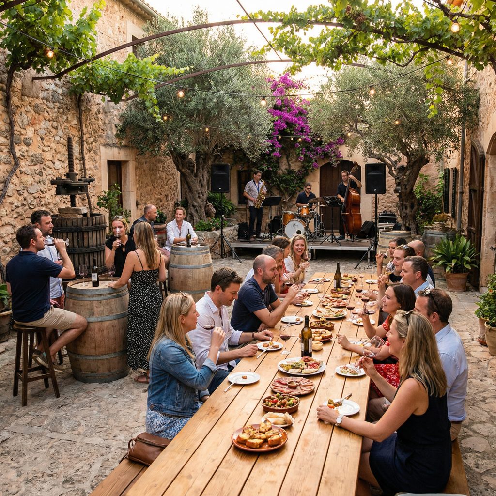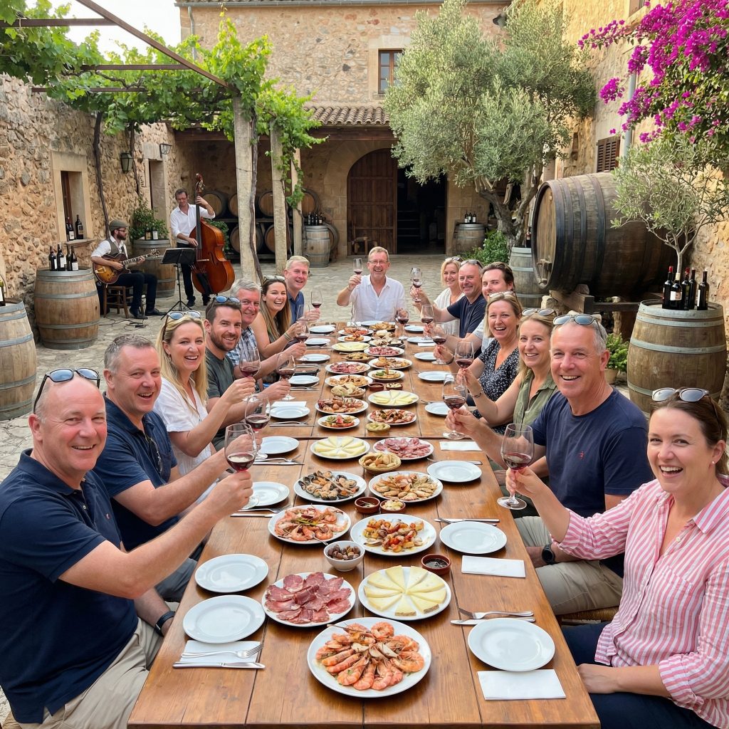 Nach dem Frühstück wird’s außergewöhnlich: Wir heben ab zum Helikopterflug über Mallorca – die Insel wirkt von oben wie eine perfekt gezeichnete Landkarte aus Buchten, Bergen und kleinen Dörfern. Danach landen wir wieder im Genussmodus und gehen zum Lunch über, mit dem angenehmen Gefühl, gerade die „Drohnenperspektive in Kinoqualität“ erlebt zu haben. Am späten Nachmittag tauchen wir in Mallorcas Weine ein: Bodega-Tour inklusive Weinverkostung und typisch mallorquinischen Tapas/Köstlichkeiten. Nebenbei lernt man, dass hier nicht nur Sonne reift, sondern auch Charakter – lokale Rebsorten wie Manto Negro oder Prensal Blanc sind so mallorquinisch wie Trockenmauern und Zypressen. Und falls jemand fragt, warum alles so entspannt wirkt: Das ist keine Langsamkeit – das ist Insel-Timing. Ein Tag, der zeigt, dass Technik und Genuss sich nicht ausschließen, sondern perfekt abwechseln.